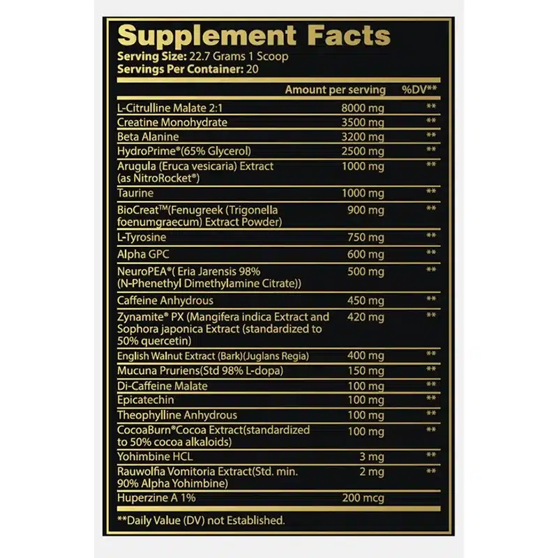Beta Alanine (3200 mg): Delays muscle fatigue, allowing for longer and more intense training sessions.