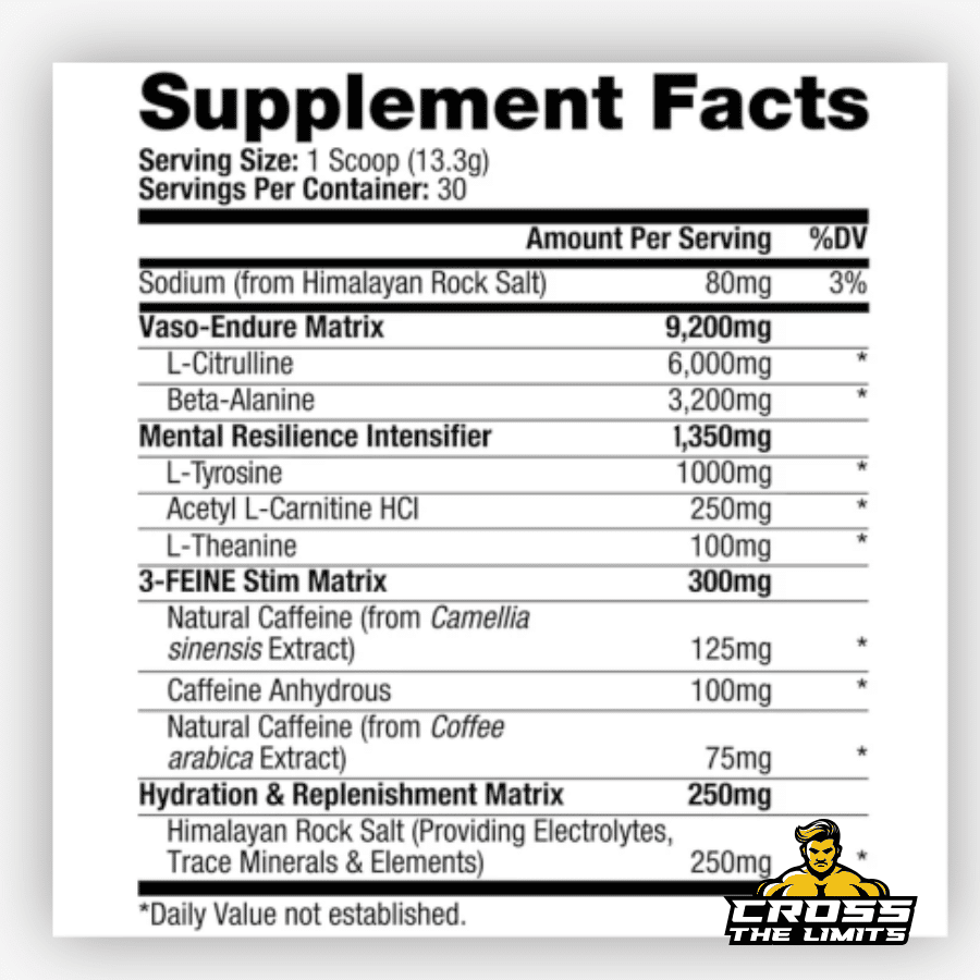 L-Citrulline, Beta-Alanine, L-Tyrosine, Acetyl L-Carnitine HCl, L-Theanine, Natural Caffeine (from Camellia sinensis extract), Caffeine Anhydrous, Natural Caffeine (from Coffee arabica extract), Himalayan Rock Salt.