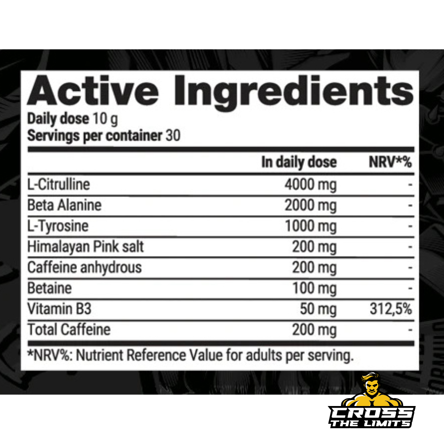 L-Citrulline, Beta-Alanine, L-Tyrosine, Caffeine Anhydrous, Betaine, Himalayan Pink Salt, Vitamin B3 (Niacin).