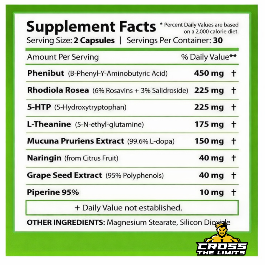 The combination of Rhodiola, 5-HTP, Theanine, and additional support ingredients creates a balanced effect — helping reduce stress while maintaining clarity and function.