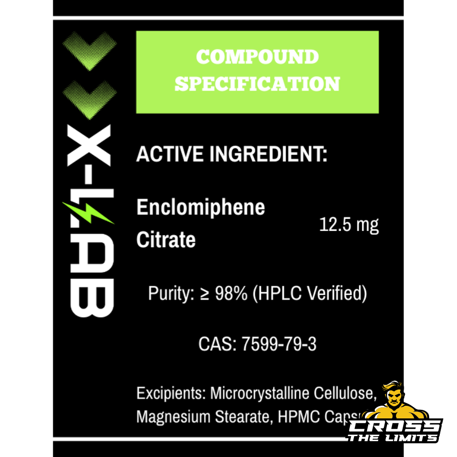 Each capsule contains 12.5 mg of Enclomiphene Citrate, produced from high-purity raw material and verified to ≥98% purity by HPLC. The formulation is kept minimal, focusing on accurate dosing and reliable quality.